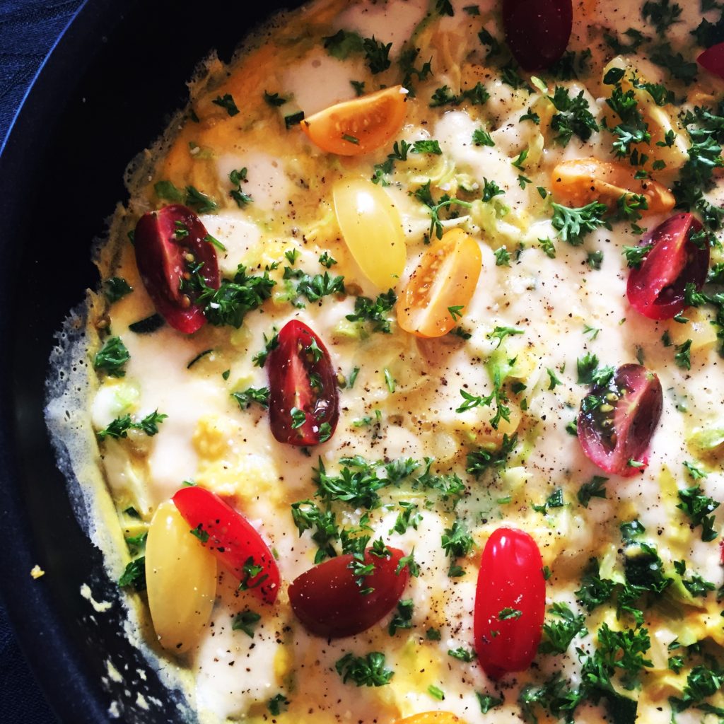 Æggekage med spidskål og mozzarella er altså bare en fantastisk ret, som kan bruges både til brunch og aftensmad. Her har vi brugt spidskål, forårsløg og mozzarella for at give den noget mere smag. Kan du lide det, smager det også godt med et strejf af muskat. På toppen skal der bare masser af urter, så kører det :-).